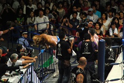 コーナーに上ってハイフライフロー式プランチャ(右写真)。