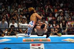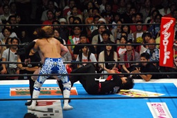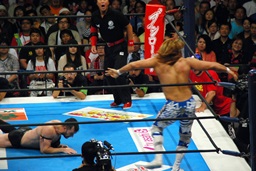 バックハンドチョップ、またコーナーに振る、コーナーに上ってダイビングフットスタンプ(右写真)、棚橋かわして低空ドロップキック。