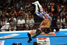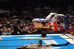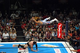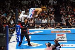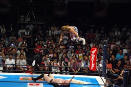 ボディスラムからコーナーに上ってサマーソルトドロップ(右写真)、カウント2。
