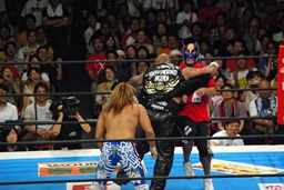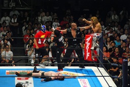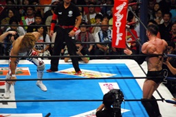 棚橋ロープに飛ぶ、ファレが足を引っ張る(右写真)。デヴィットロープに飛ぶ、キャプテンが足を引っ張る。