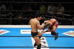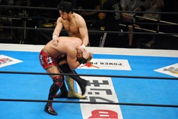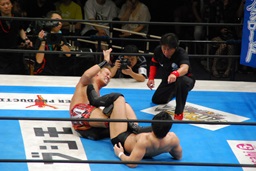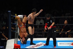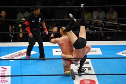 オカダ串刺しビッグブーツをかわして足へのキック、ネックブリーカードロップ(左写真)。5分経過。