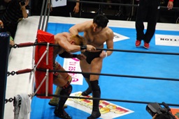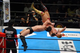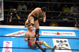 柴田ミドルキック、オカダキャッチ、持ち上げてリバースネックブリーカー(左写真)。