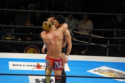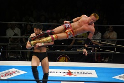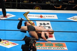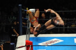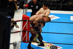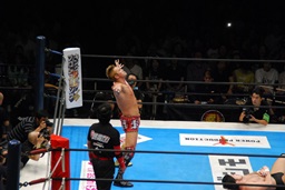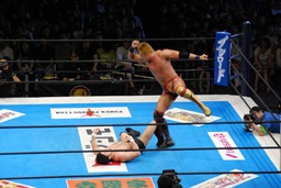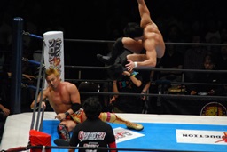 オカダボディスラム、コーナーに上ってダイビングエルボードロップ(右写真)。