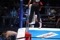 ドロップキック一発でムード変わった。その前のレインメーカー式キチンシンクはやりすぎというかナメすぎだったかな。