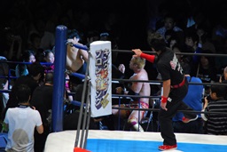 顔面キック、コーナーに詰めてパンチ連打(右写真)。