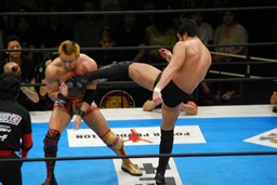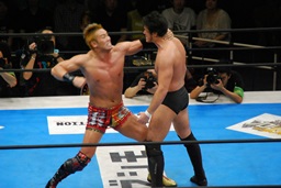 柴田ミドルキック、エルボー、オカダもエルボー(右写真)。