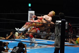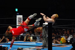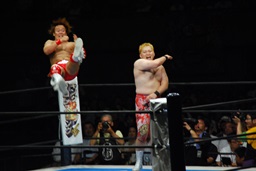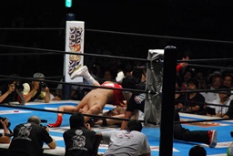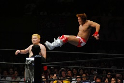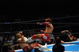 矢野ロープに飛ぶ、内藤カウンターのドロップキック(右写真)。