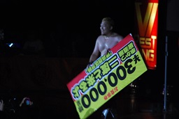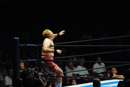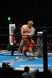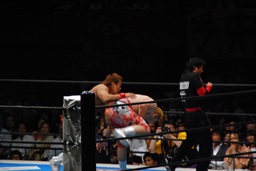 矢野内藤を押す、レフェリーとぶつかりそうになりレフェリーが目を背ける、そこに急所打ち、赤霧で丸め込む(右写真)、カウント3。