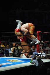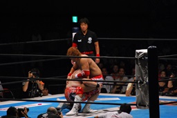内藤コーナーに上って背中にミサイルキック(左写真)、