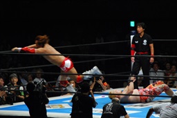 エプロンからトップロープ飛び越えてもう一発ドロップキック(左写真)。ロープに振ってヒップトスからドロップキック、ネックブリーカードロップ、カウント2。