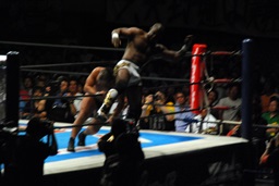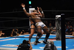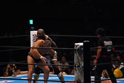 ロックアップ、ベンジャミンがロープに押し込む、鈴木体勢入れ替える(左写真)、ブレーク。