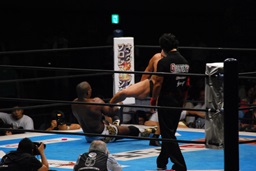 エプロンの鈴木にスーパーキック(左写真)、鈴木場外に落ちるがベンジャミンはすぐにリングに戻す。