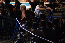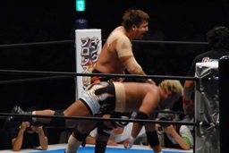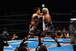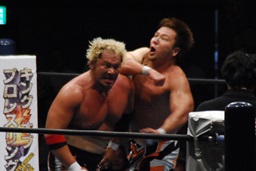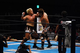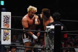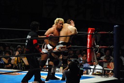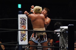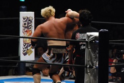 対角線コーナーに振って串刺しエルボー(左写真)、「行っちゃうぞバカヤロー!」は行けず。