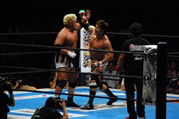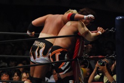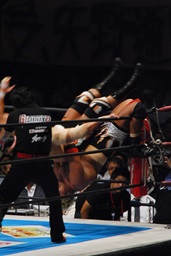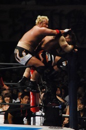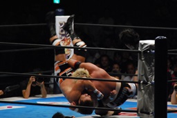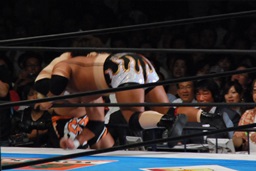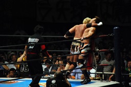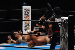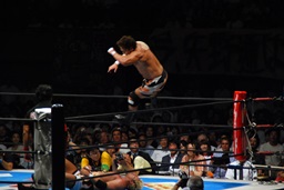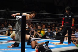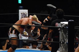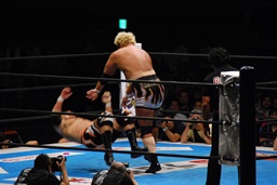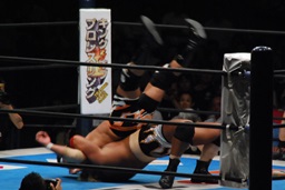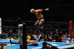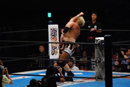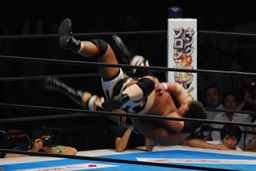 真壁をリングに戻すと「行っちゃうぞバカヤロー!」なしでコーナーに上ってダイビングエルボードロップ(左写真)、カウント2。