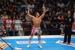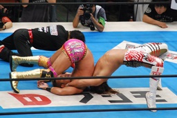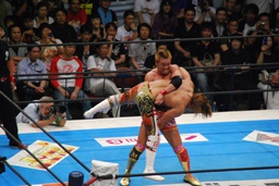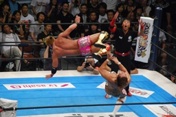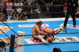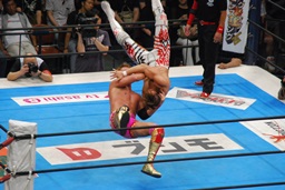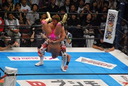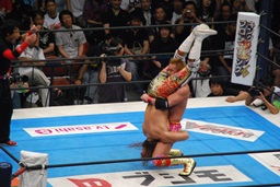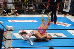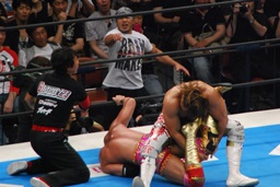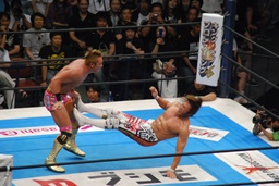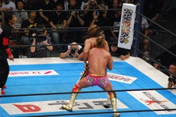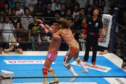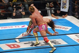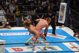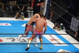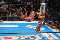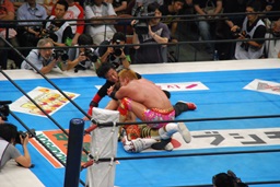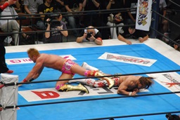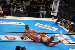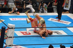 両者ダウン、棚橋起き上がるとドラゴンスープレックス(右写真)、カウント2。残り試合時間2分。