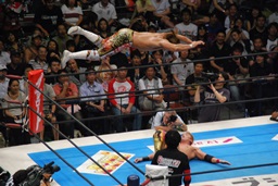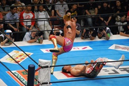 棚橋コーナーに上ってハイフライフロー、オカダかわす(左写真)。