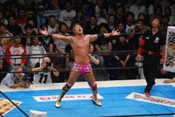 オカダ場外に投げ飛ばす、棚橋は逆上がりで戻る(左写真)。
