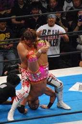 棚橋再度ドラゴン狙うがオカダブロック、持ち上げてリバースネックブリーカー(右写真)、ダブルダウン。