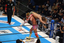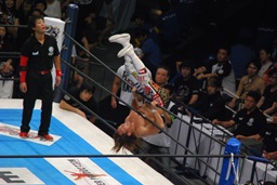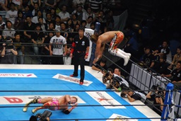 コーナーに上ってハイフライフロー(右写真)、オカダはヒザを立ててブロック。残り試合時間1分。