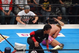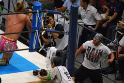 外道がマットをばんばん叩いてオカダを鼓舞(左写真)。
