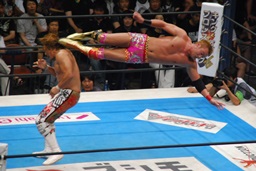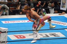 オカダレインメーカー行くが棚橋かわしてロープに飛ぶ(右写真)、