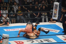 垂直落下式ブレーンバスター(右写真)、カウント2。10分経過。