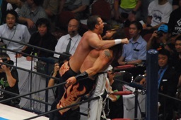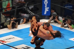 コーナーに上ってムーンサルトプレス(右写真)、カウント2。