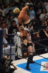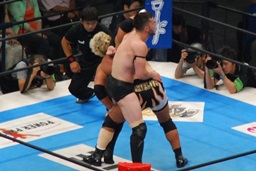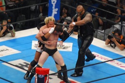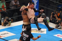 真壁デヴィットを肩に担ぐ、またファレが入って真壁のノドをつかむ(右写真)。