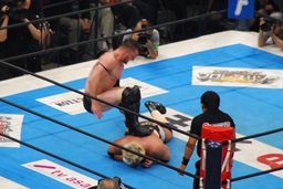 真壁フルネルソン、デヴィットブロック(右写真)、足がレフェリーに当たってレフェリーダウン。