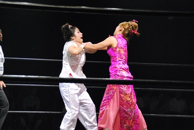 反則カウントを「イー、アル」じゃなくて「ワン、ツー」と国際式で言ってしまったマ・ツィ・イーレフェリーは苦笑い(左写真)。