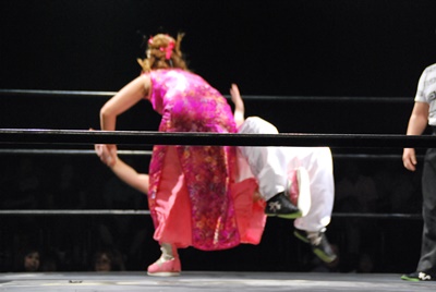 チェ・リーリングに戻ると石喬の顔面にドロップキック(左写真)、