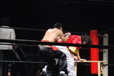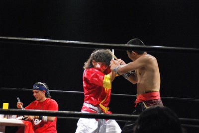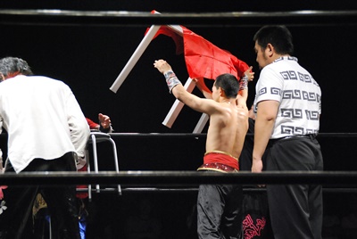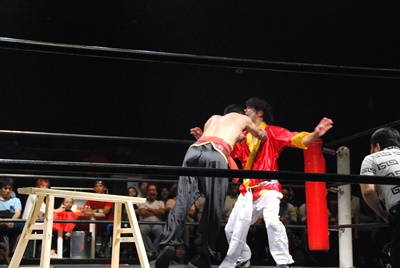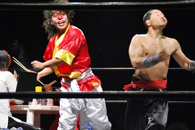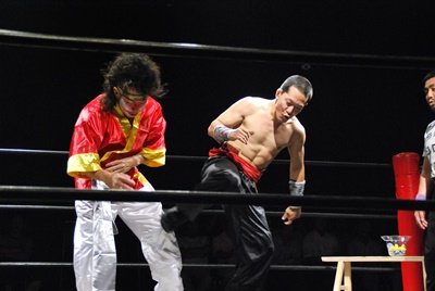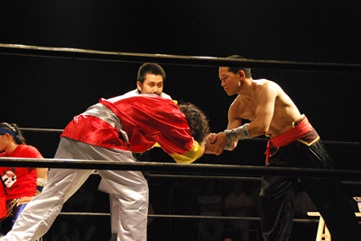 趙雲はテーブルからトップロープ踏み台に3ステップミサイルキック(左写真)、馬良と曹彰が飲んでたテーブルに一直線。10分経過。