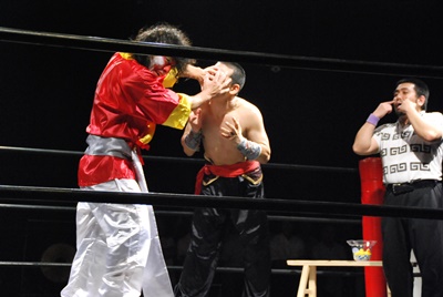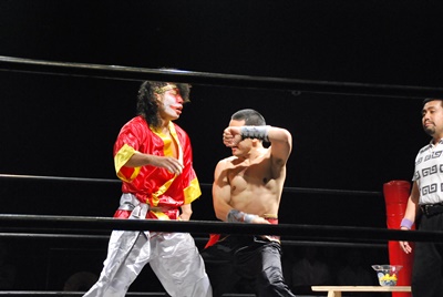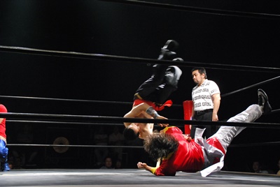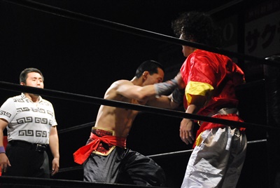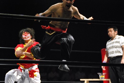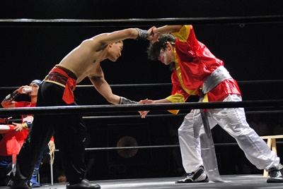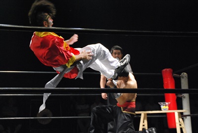 悟空切り返してフルネルソン(左写真)、趙雲足をすくってレッグロック。