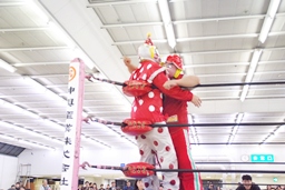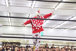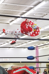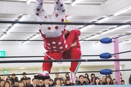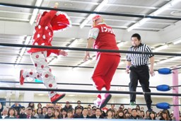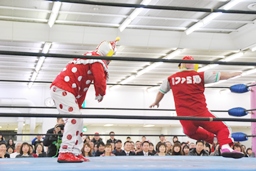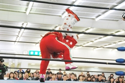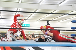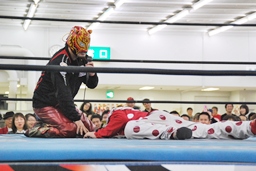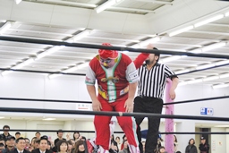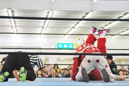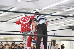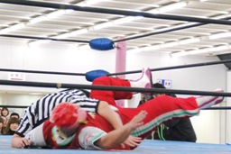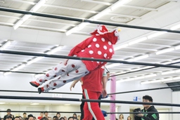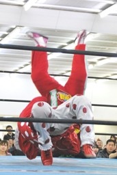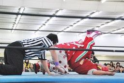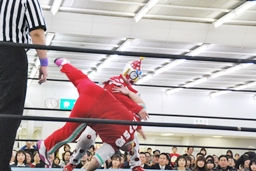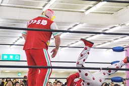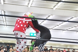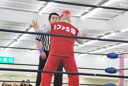 くいしんぼうボディスラム、コーナーに上って関空トルネード(左写真)、カウント3。
