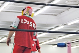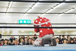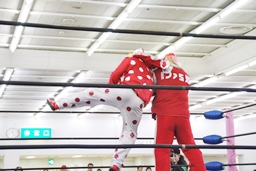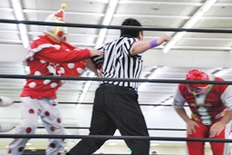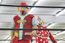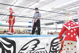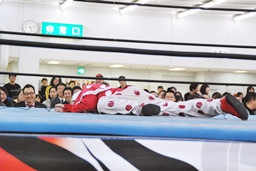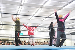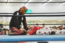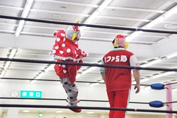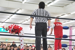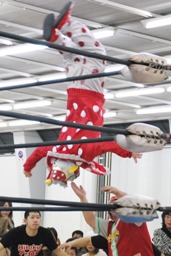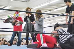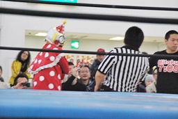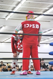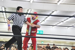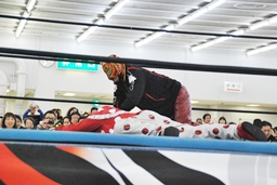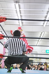 くいしんぼう菊タローをコーナーに上げて雪崩式フランケンシュタイナー(右写真)、カウント2。