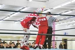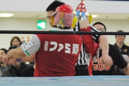 菊タローブルドッギングヘッドロック狙うがくいしんぼうはブロック(右写真)。