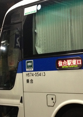 仙台に向け久々の夜行バスで出発、ということでバスの中で寝られるようにドロップキックでビール2杯飲む。23時30分になったのでドロップキックを退去して新南口のJRバスターミナルに。しかし行けども行けどもターミナルがない。南口工事のために代々木駅近くまで行ってしまっていた。しかもホームと電光掲示板はあれど、何番線に入るかは前のバスが行かないとわからないというひどさ。バス事業手ぇ抜きまくりだな、JR。ともあれ23時59分発のドリーム政宗号は日付変わった0時3分に代々木駅前を出発。