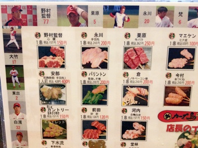 メニューが全部選手名。ダジャレになってるのは丸がうずらの卵なくらいか。あと野村監督は心臓。