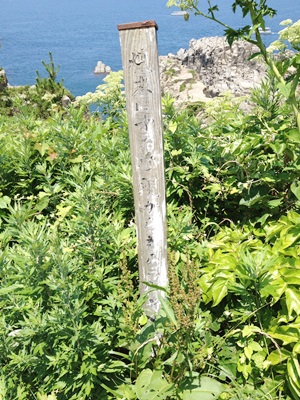 朽ち果てた「粗末にするな親にもらったその命」の標柱。今はそんなに飛び込む人もいないのかな?観光客多いしな。ただ花束のものと思われるリボンはあったが。