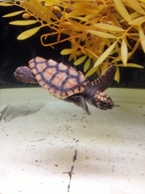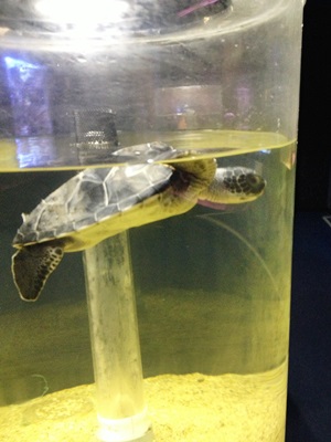 去年たくさん能登海岸で保護されたらしいウミガメのうち一匹。何かが壊れて日本海に来たんだろうから「戻す」ってわけにも行かないんだろうなあ。