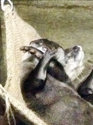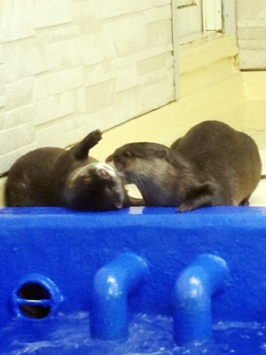 そしていよいよカワウソ。ここも2部屋に分かれているが、両親+去年生まれた子の3匹と前回生まれた3つ子に分かれているそうだ。