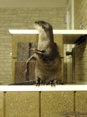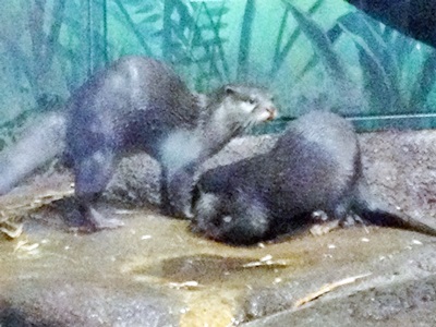 3階にカワウソということで4階までエレベーターまで上がり、4階はさらっと見てすぐカワウソ舎に。巣穴の部屋に2匹。隣の広い部屋にもう2匹いるのに後で気づいた。そっちは自然光を採り入れてるので写真撮りやすいが巣穴の方は暗いのでiPhoneで。ちょっと動くとブレる。