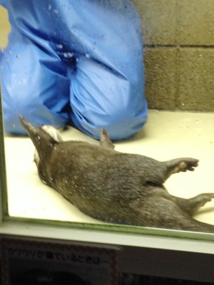 健康チェックのために転がってみせる。ガラスに触るなと書いてあるのに叩くのは子供じゃなくてやっぱりおばさん。