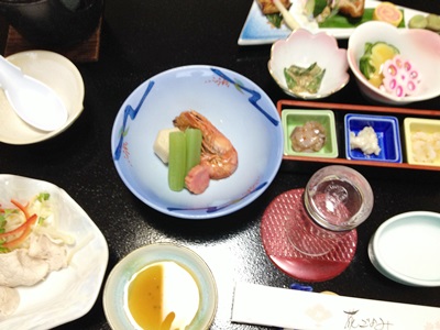 駅から結構ありそうだったのでタクシー使って今夜の旅館「花ごよみ」に。久々の温泉旅館だ。まずひとっ風呂浴びて夕食。久々の旅館飯だ。1人客用に6畳部屋を用意してるのはありがたい。