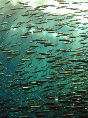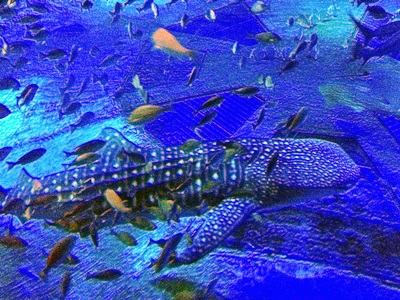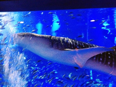 でかい水槽にジンベイザメ2匹と他の魚多数。
