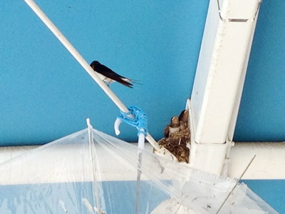 屋根にはツバメ。ふんが客に当たらないよう傘を逆さにして吊ってあった。