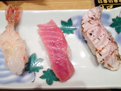金沢に着いて東横インに荷物を置いたのが14時過ぎと普通の店はランチ終わってる時間だったので近江町市場(観光地なので日曜だろうが何時だろうが開いてるし、むしろ空いてる)まで歩いて寿司。まずはノドグロのあぶり、中トロ、ボタンエビのぜいたくセット。