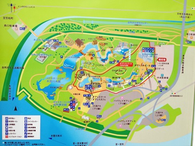 案内図。「河川環境楽園」という名前を見たときはどんな施設だ?と思ったが、世界淡水魚園水族館「アクア・トトぎふ」以外にもいろんな施設がある県営の水のテーマパークだった。岐阜川島PAとつながってるので車なら来やすいようだが車ないとキツい。バス本数少ないし。夏は水族館前まで来るから700m歩く必要ないらしいが。