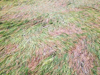 2日前の熱帯低気圧かその前の台風にやられた収穫寸前のイネ。農業ってこれだから怖いよなあ。