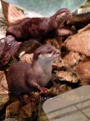 で、新屋島水族館のコツメカワウソ。人気者のメイ。ひしゃくでエサ(魚の切り身)をあげると握手してくれる。年齢12歳なので人間で言えば70歳。